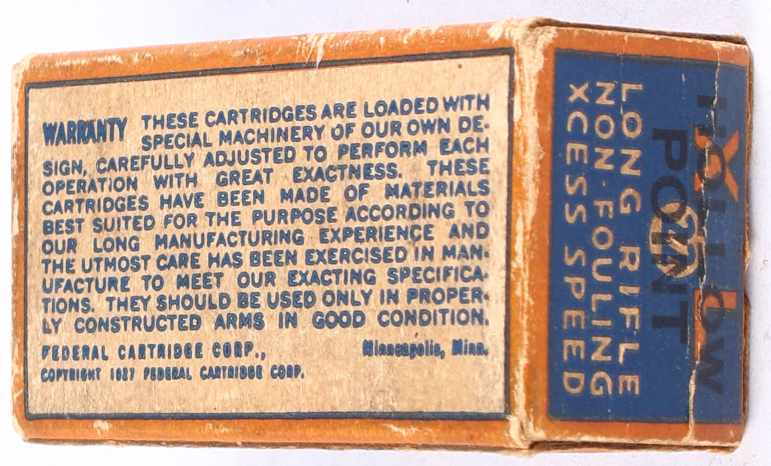 Federal, XL Cartridges, .22 Long Rifle Hollow Point, RHWeb: FCC-4.1 LR-2b, Full, 1pc. Blue orange & white box, box is solid with very good color, minor age soiling & corner wear, very minor edge wear, end flaps are solid, ammo is excellent. Grade: Very Good ++ - Value: 150 to 225