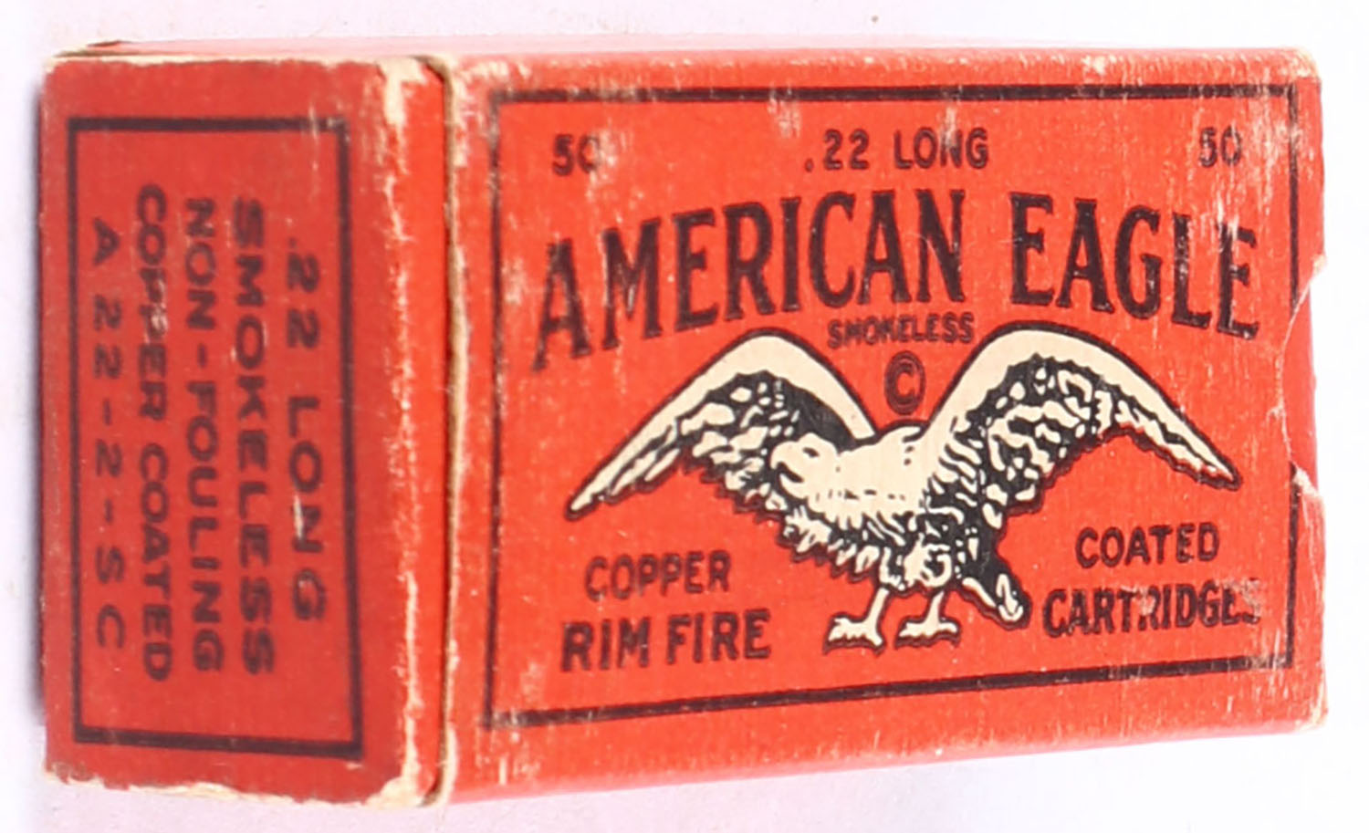 American, American Eagle, .22 Long, Copper Coated, Non-Fouling, RHWeb: ACC-1 L-2 Partial 35rds. 1pc. Red black & white box, box is solid with excellent color, very minor age soiling, minor shelf wear, some corner wear, edges are mostly crisp, end flaps are solid, ammo is excellent. Grade: Very Good ++ - Value: 50 to 75