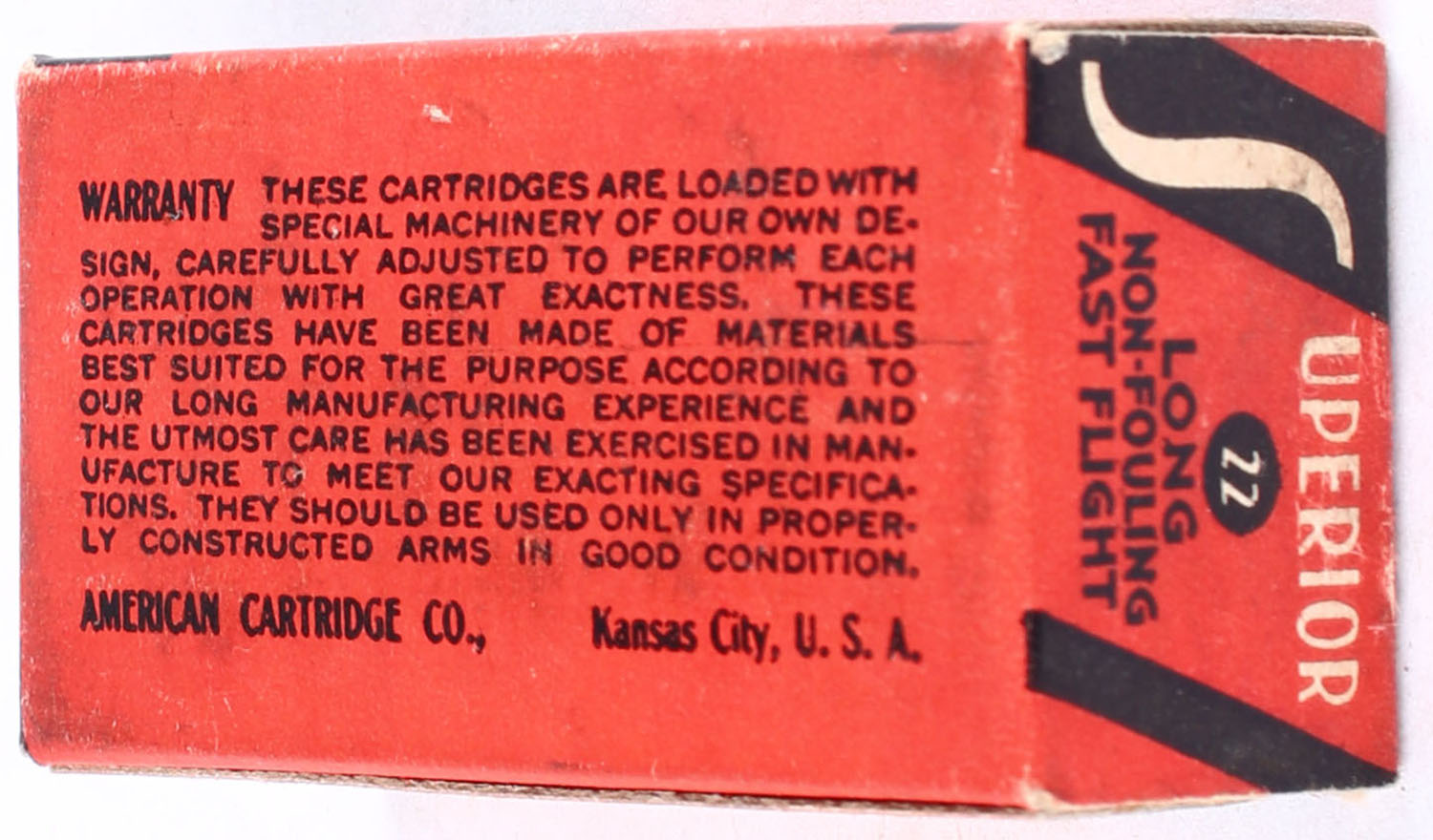 American, Superior Cartridges, .22 Long Hollow Point, RHWeb: ACC-2 L-2, Full, 1pc. Red black & buff box with ''Hollow Point'' over-stamp, box is solid with very good to excellent color, minor age soiling, some corner wear, edges are crisp, end flaps are solid, ammo is excellent. Grade: Very Good ++ - Value: 80 to 120