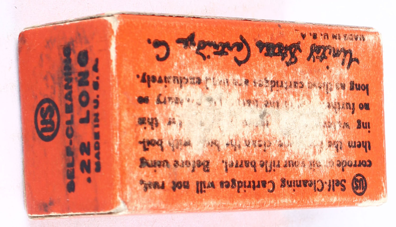 U.S., Self-Cleaning, .22 Long, Coppered Bullet, RHWeb: US-10B L-4, Partial 24rds. 1pc. Orange & black box, box is solid with excellent color, minor edge & corner wear, end flaps are solid, ammo is excellent. Grade: Excellent - Value: 10 to 15