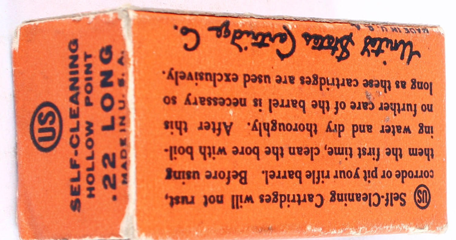 U.S., Self-Cleaning, .22 Long, RHWeb: US-10A L-2, Partial 44rds. 1pc. Orange & black box, box is solid with very good to excellent color, minor age soiling some edge & corner wear, end flaps are solid, ammo is very good. Grade: Very Good + - Value: 50 to 75