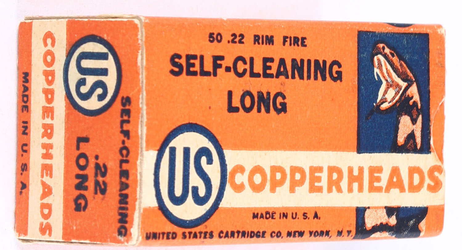 U.S., Copperheads, .22 Long, Self-Cleaning, RHWeb: US-12 L-1b, Full, 1pc. Orange white & blue box, box is solid with excellent color, very minor age soiling & corner wear, edges are crisp, end flaps are solid, ammo is excellent. Grade: Excellent + - Value: 220 to 330