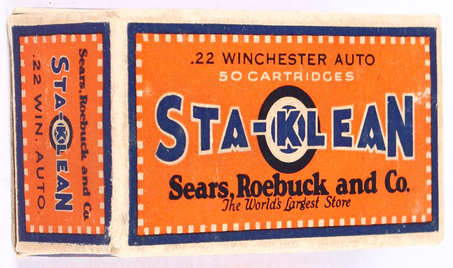 Sears, Sta-Clean, .22 Winchester Auto, RHWeb: SEARS-2 WA-1, Full, 1pc. Orange blue & buff box, box is solid with excellent color, minor corner wear, edges are mostly crisp, end flaps are solid, ammo is excellent. Grade: Excellent + - Value: 50 to 75
