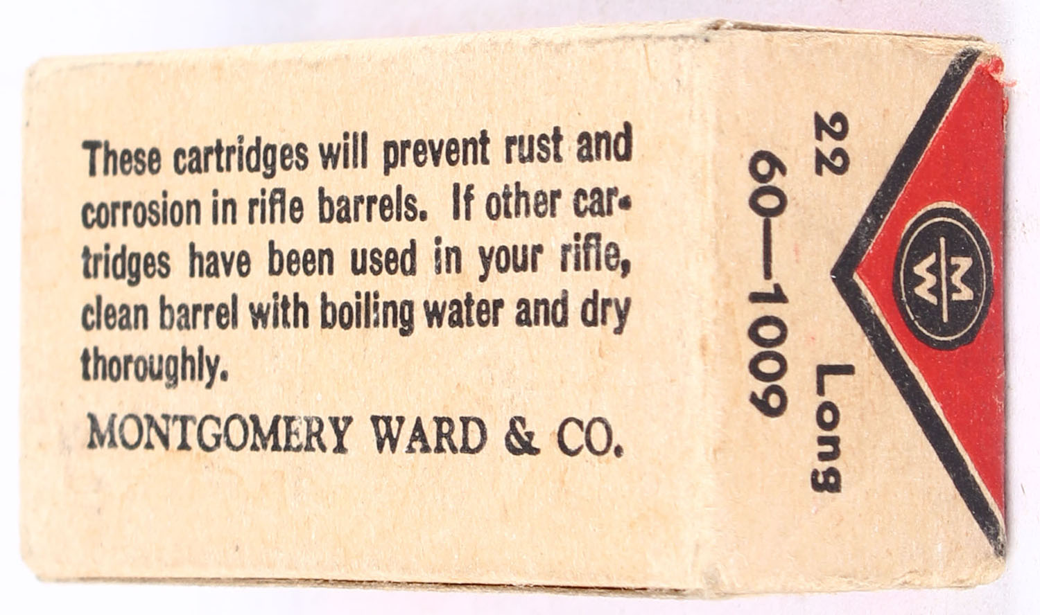 Wards, Cleanfire, .22 Long, Copper Coated, RHWeb: MW-3D L-1, Partial 49rds. 1pc. Red buff & black box, box is solid with very good color, minor age soiling & corner wear, very minor edge wear, end flaps are solid, ammo is excellent. Grade: Very Good ++ - Value: 30 to 45