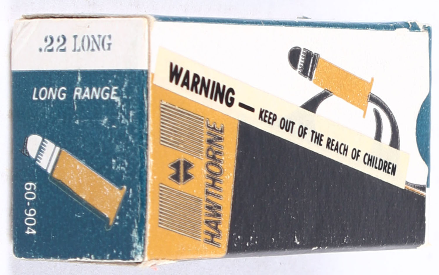 Wards, Cleanfire, .22 Long, Lead Lubricated, RHWeb: MW-5A L-2(?) (has black front & blue back panels), Full, 1pc. Black blue & white box with white child warning over-label, box is solid with excellent color, very minor edge & corner wear, end flaps are solid, ammo is excellent. Grade: Excellent + - Value: 16 to 24