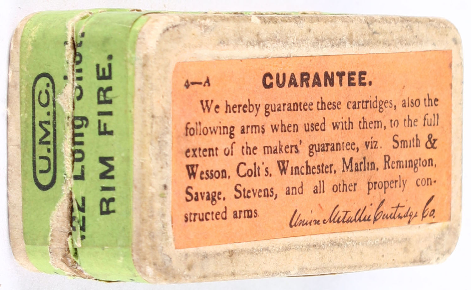 UMC, Shot Cartridges, .22 Long Shot, RHWeb: UMC-8 L-7, Full, 1pc. Buff box with green top & side sealing labels, box is solid with excellent color, very minor edge & corner wear, labels are intact, ammo is excellent. Grade: Excellent + - Value: 100 to 150