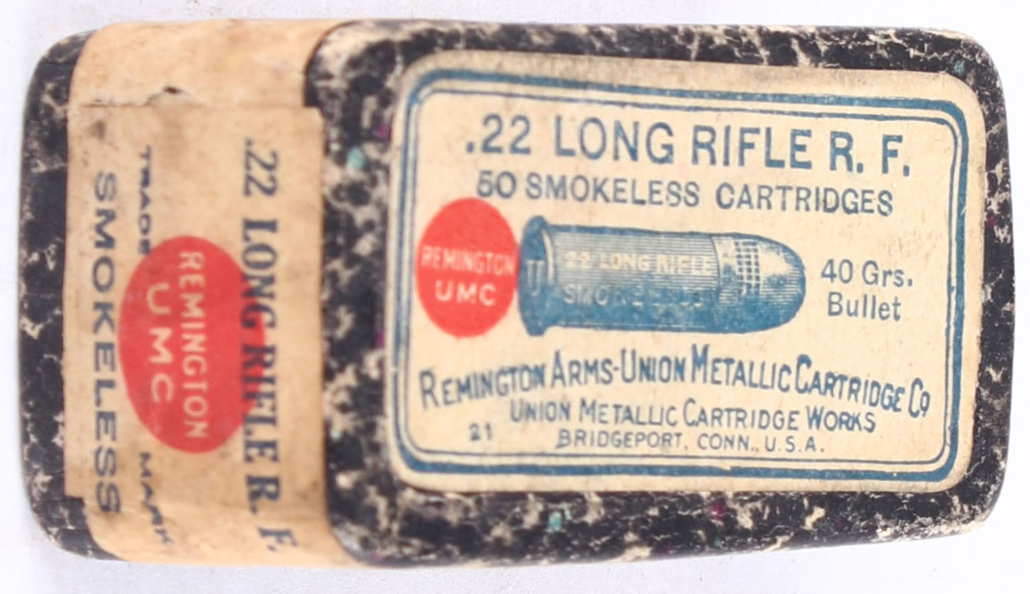 REM-UMC, R.F. Smokeless Cartridges, .22 Long Rifle, 40 Grs. Bullet, RHWeb: REM-2 LR-5E, FULL & SEALED, 2pc. Black mottled box with buff top & side sealing labels, box is solid with excellent color, very minor age soiling & corner wear, edges are mostly crisp, labels are intact. Grade: Excellent + - Value: 50 to 75