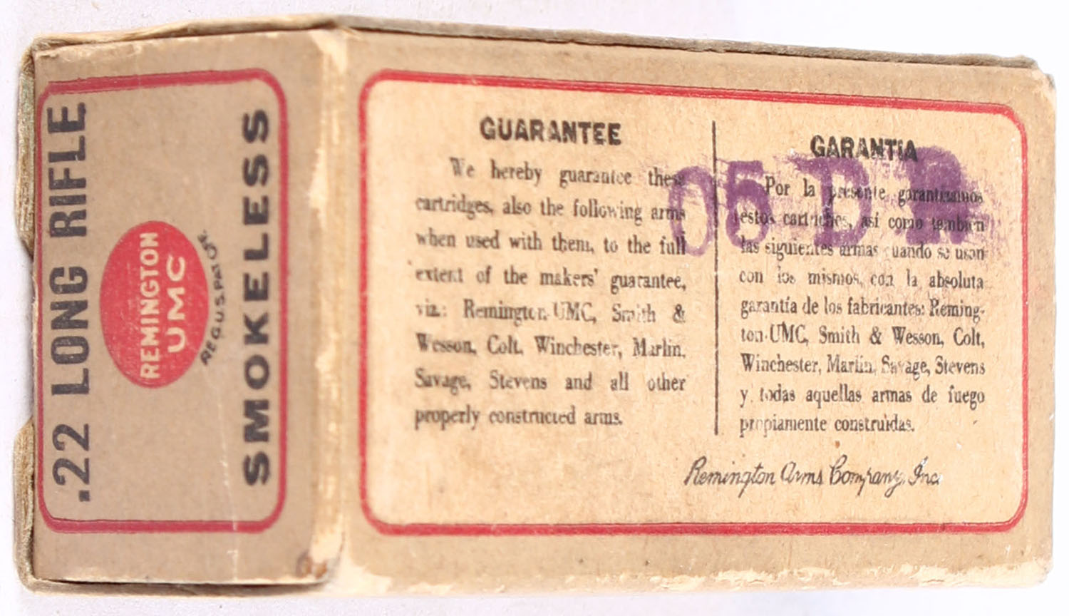 REM-UMC, R.F. Smokeless Cartridges, .22 Long Rifle, RHWeb: REM-5 LR-2, Partial 25rds., 1pc. Buff black & red box, box is solid with very good color, minor color fading, top has been written on, some edge & corner wear, end flaps are solid, ammo is very good. Grade: Very Good + - Value: 10 to 15