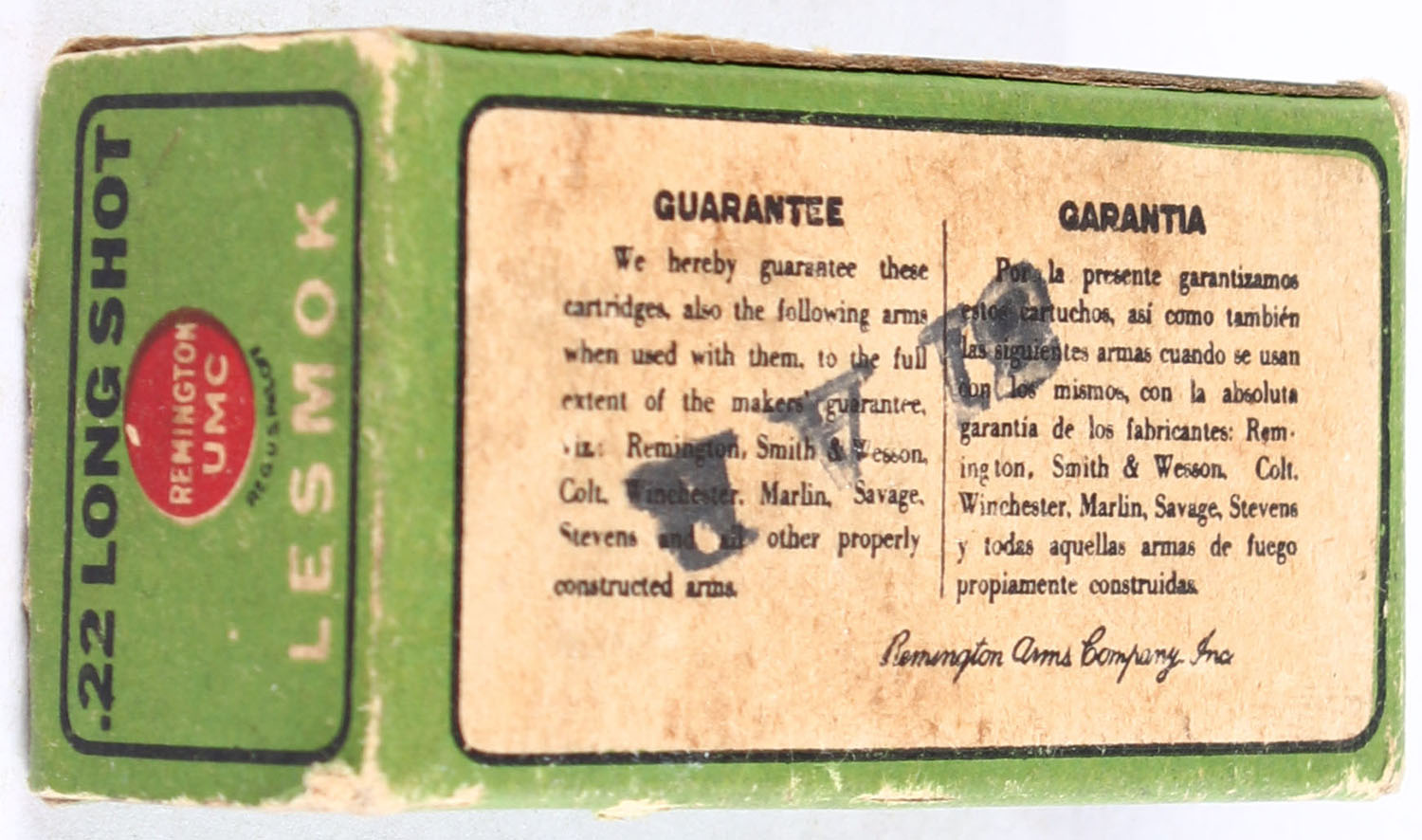REM-UMC, R.F. Lesmok Shot Cartridges, .22 Long Shot, RHWeb: REM-6 L-3, Full, 1pc. Green & black box, box is solid with excellent color, very minor age soiling, some edge & corner wear, end flaps are solid, ammo is excellent. Grade: Very Good ++ - Value: 60 to 90