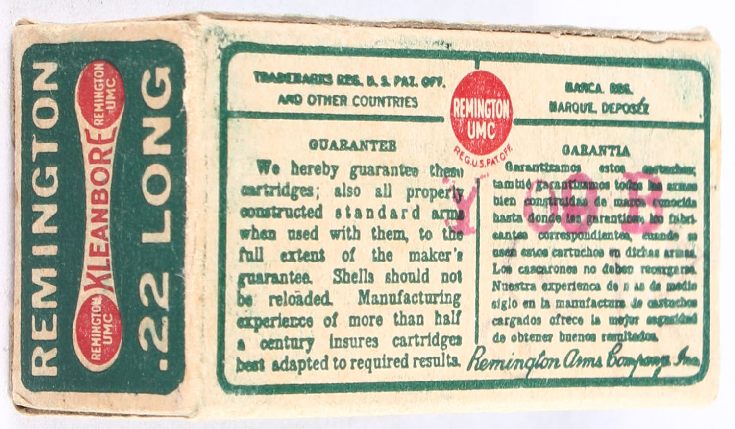 Remington, Kleanbore, .22 Long, RHWeb: REM-7.1A, L-1c, Full, 1pc. Green buff & red dog bone box, box is solid with excellent color, very minor age soiling & corner wear, edges are mostly crisp, end flaps are solid, ammo is very good. Grade: Excellent - Value: 40 to 60