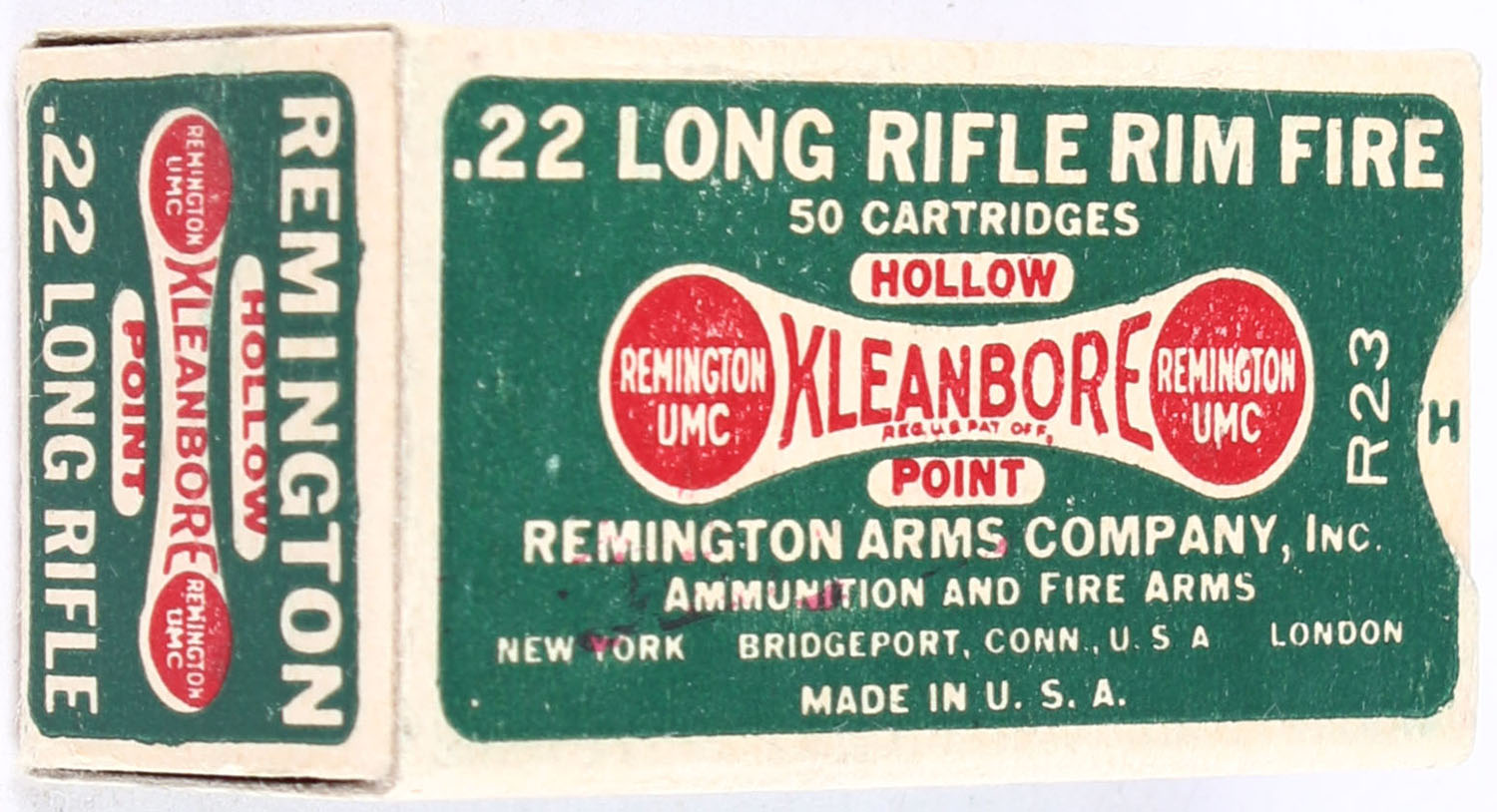 Remington, Kleanbore, .22 Long Rifle Hollow Point, RHWeb: REM-7.1B LR-2, Full, 1pc. Green buff & red dog bone box, box is solid with excellent color, very minor shelf & corner wear, edges are crisp, end flaps are solid, ammo is excellent. Grade: Excellent ++ - Value: 20 to 30