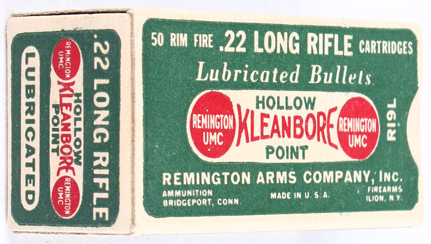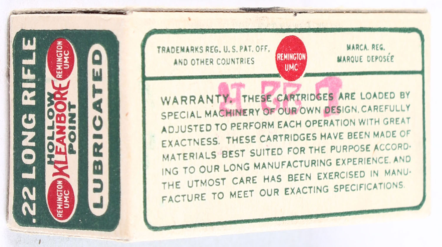 Remington, Kleanbore Lubricated, .22 Long Rifle Hollow Point, RHWeb: REM-7.2 LR-4e, Full, 1pc. Green buff & red dog bone box, box is near mint with minty color, only very minor stain on bottom back edge, corners are sharp, edges are crisp, end flaps are solid, ammo is very good. Grade: Excellent ++ - Value: 24 to 36