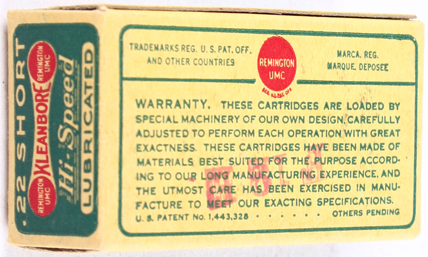 Remington, Hi-Speed Kleanbore, .22 Short, RHWeb: REM-7.4 S-1a, Full, 1pc. Green buff & red dog bone box, box is solid with excellent color, very minor staining on top, corners are mostly sharp, edges are crisp, end flaps are solid, ammo is excellent. Grade: Excellent + - Value: 12 to 18