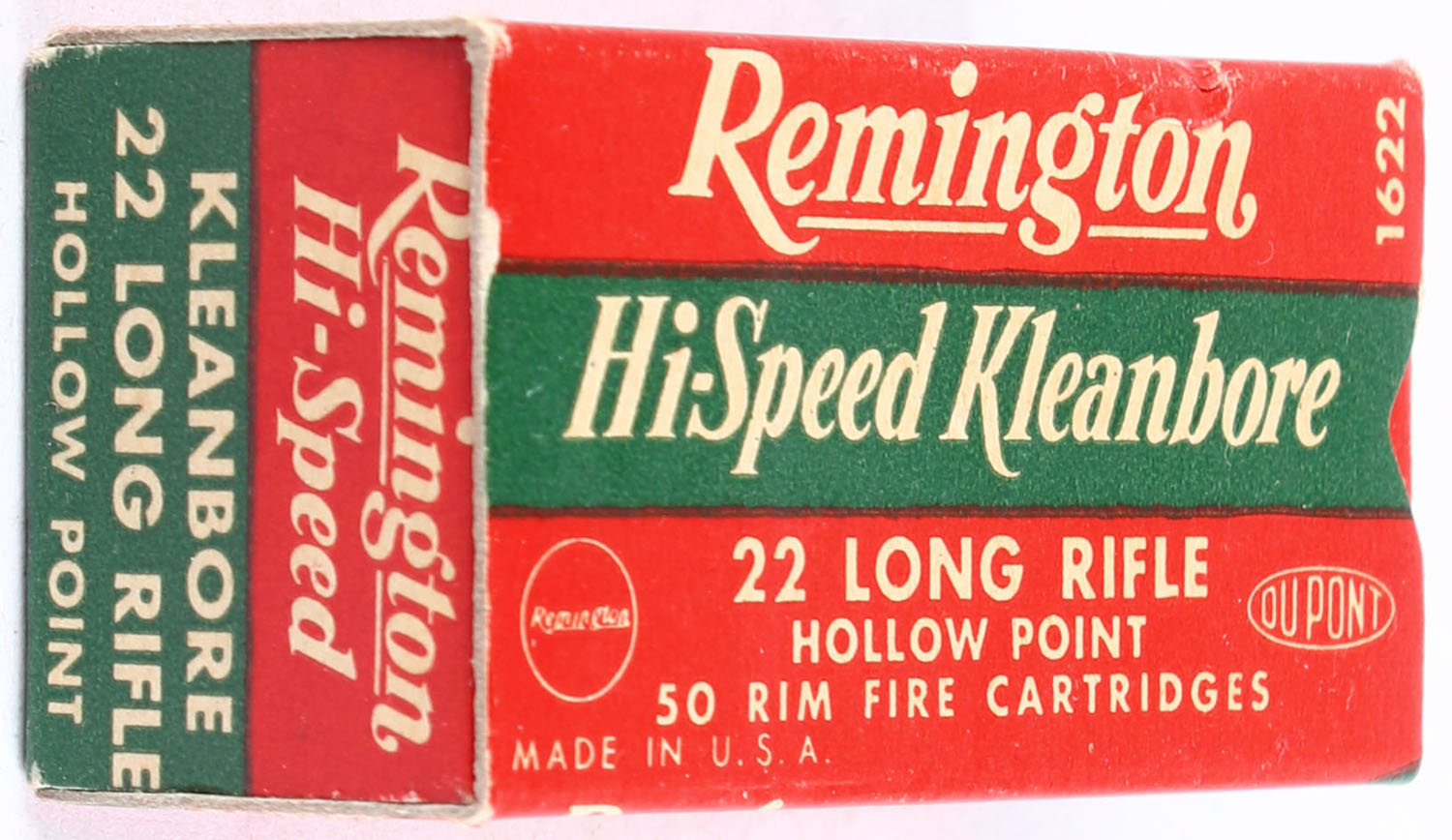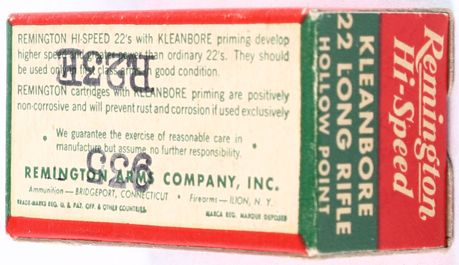 Remington, Hi-Speed Kleanbore, .22 Long Rifle Hollow Point, RHWeb: REM-14 LR-1a, Full, 1pc. Red white & green box, box is solid with excellent color, very minor age soiling & corner wear, edges are crisp, end flaps are solid, ammo is minty. Grade: Excellent +q - Value: 10 to 15