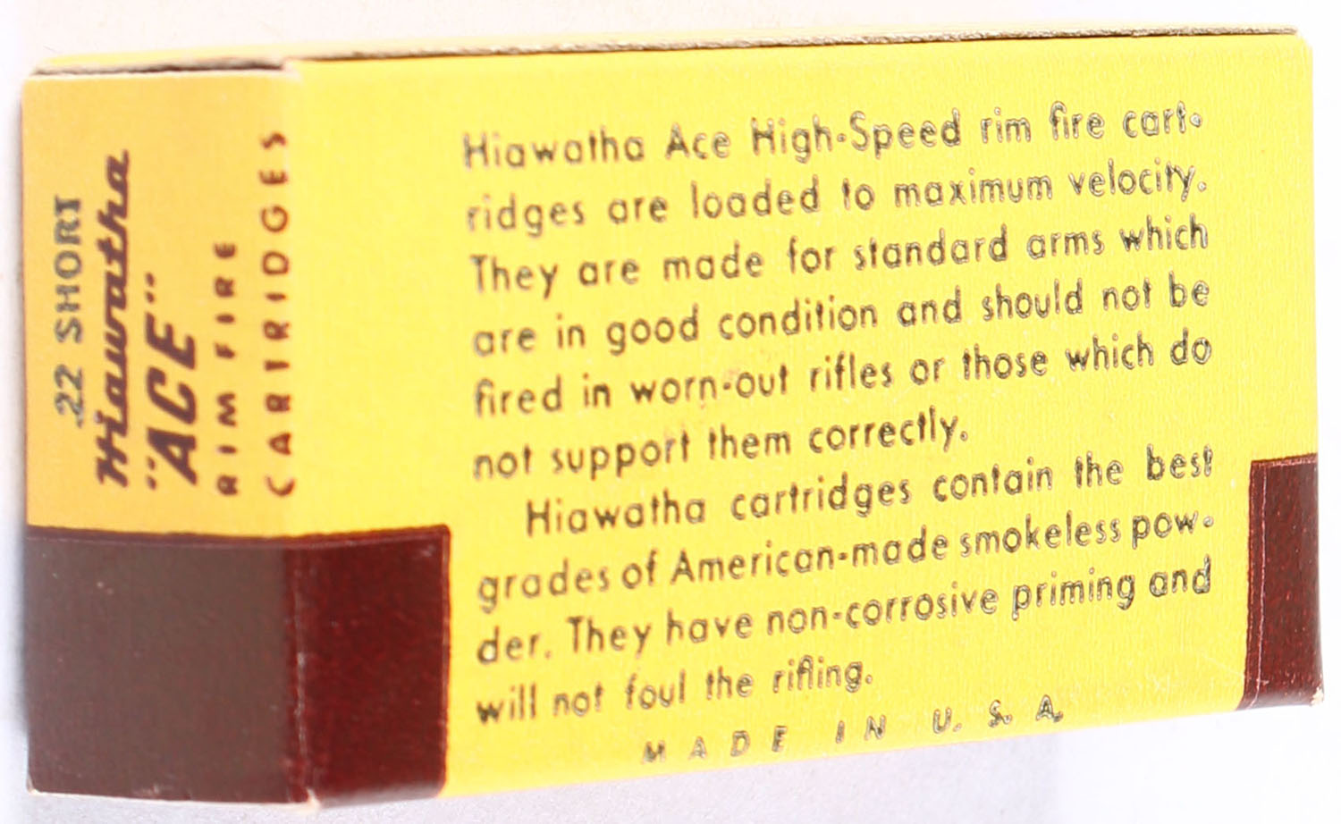 Gambles, Hiawatha ''ACE'', .22 Short, RHWeb: GS-2 S-1, Full, 1pc., yellow brown & white box, box is solid with near mint colors & condition, end flaps are solid, ammo is excellent. Grade: Excellent ++ - Value: 10 to 40