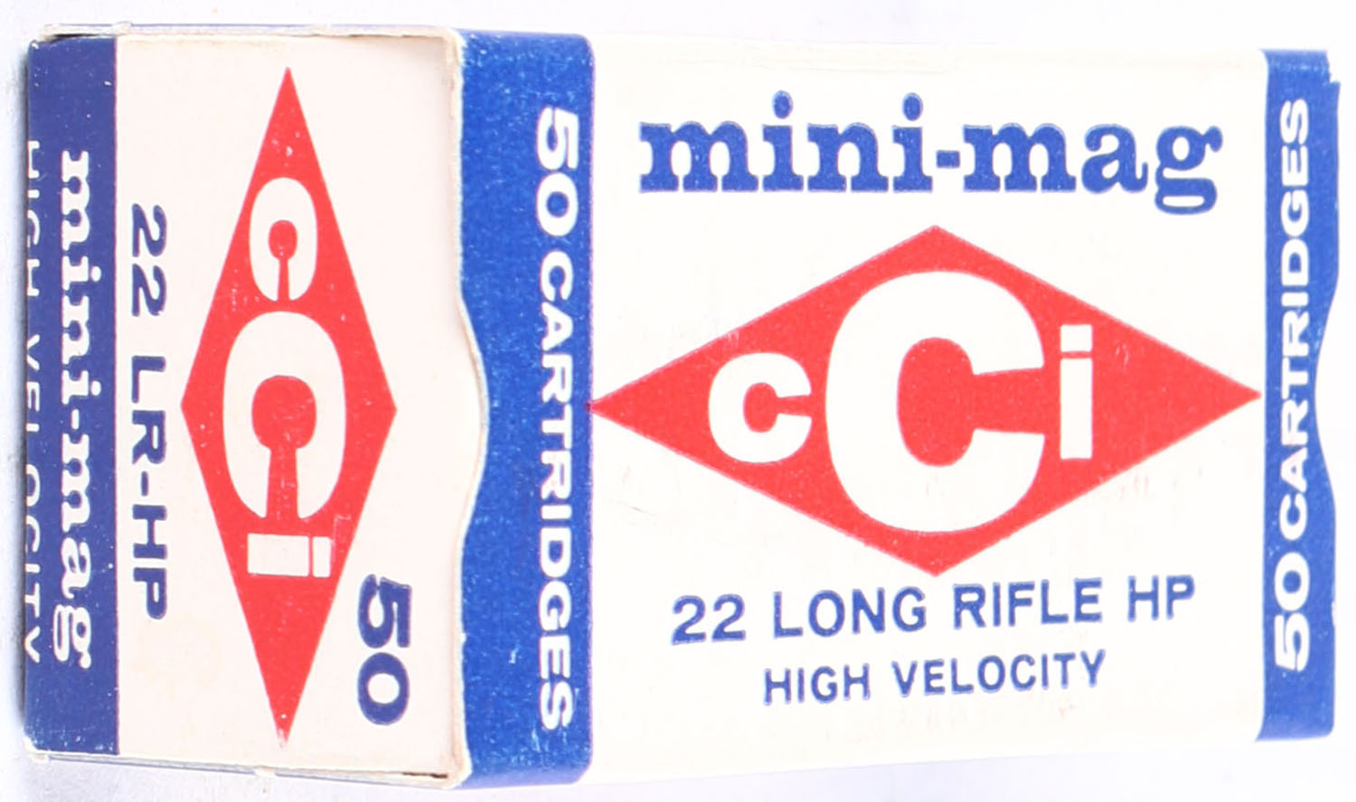 CCi, mini-mag, .22 Long Rifle HP, RHWeb: CCI-1 S-6 with o-4 HS & copper bullets, Full, 1pc. White blue & red box, box is solid with minty color, very minor corner wear, edges are crisp, end flaps are rigid, ammo is minty. Grade: Excellent ++ - Value: 10 to 20