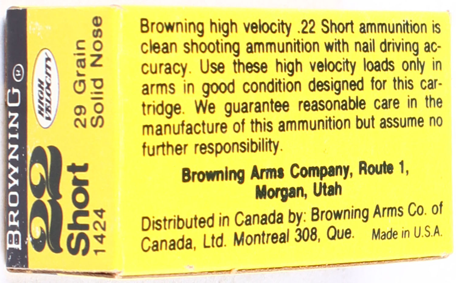 Browning, Nail Drivers, .22 Short, High Velocity, RHWeb: BROWN-1 S-1, Full, 1pc. Yellow black & white box, box is MINT with minty color, corners are sharp, edges are crisp, end flaps are solid, ammo is minty. Grade: MINT - Value: 80 to 120