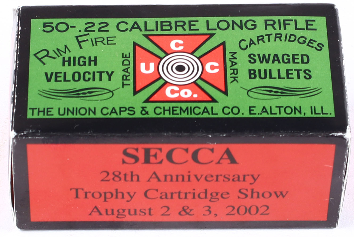 SECCA, Union Cap & Chemical, .22 Long Rifle, RHWeb: SECCA-2 2002, Full, 1pc. Green red & black box, box is near mint with minty color, only very minor corner wear, edges are crisp, end flaps are solid, ammo is minty. Grade: Excellent ++ - Value: 40 to 60