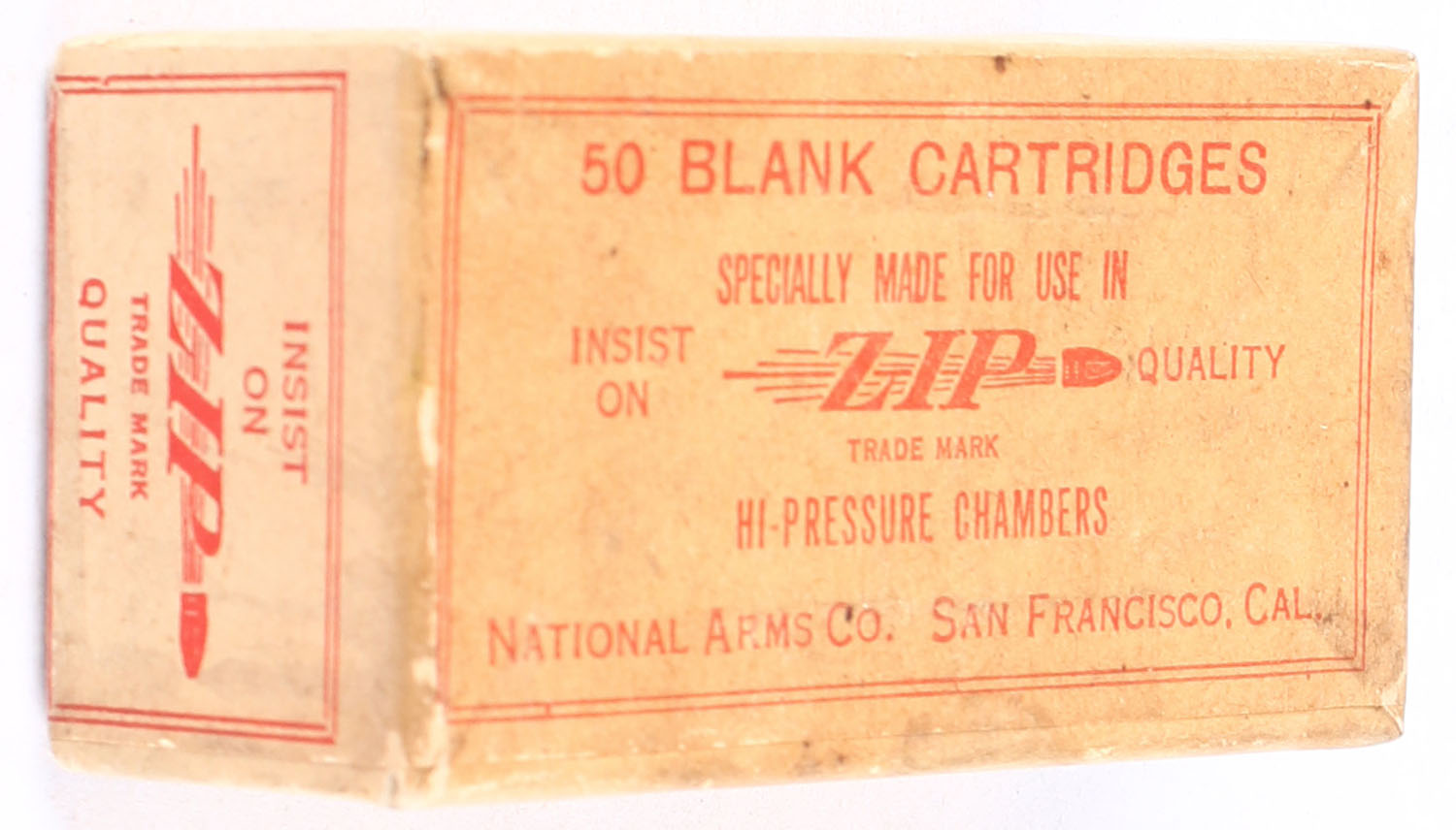 National Arms Co., Blank Cartridges, Specially Made For Use in Zip Hi-Pressure Chambers, Not in RHWeb, FULL & SEALED, 2pc. Buff box with buff & red wraparound label, box is solid with very good to excellent color, some age soiling, very minor edge & corner wear, label is intact. Grade: Excellent - Value: 12 to 18