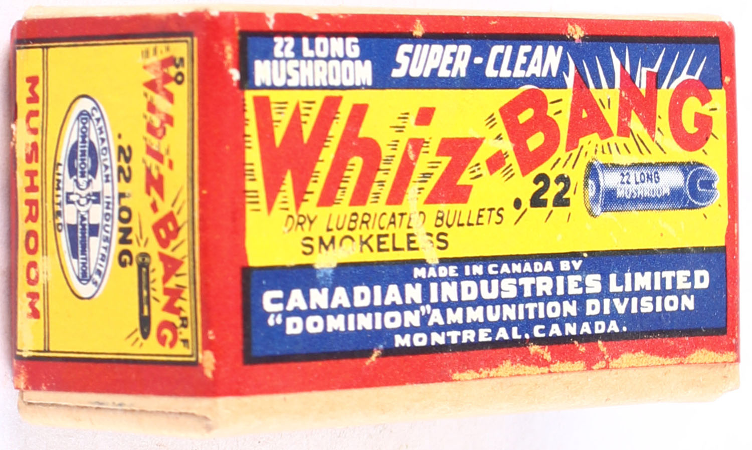 C.I.L., Whiz-Bang, .22 Long Mushroom, Dry Lubricated Bullets, Mushroom, RHWeb: CIL-2 L-4a, FULL & SEALED, 2pc. Buff box with yellow blue & red wraparound label, box is near mint with minty color, only very minor shelf wear, corners are mostly sharp, edges are crisp, label is intact. Grade: Excellent ++ - Value: 150 to 225