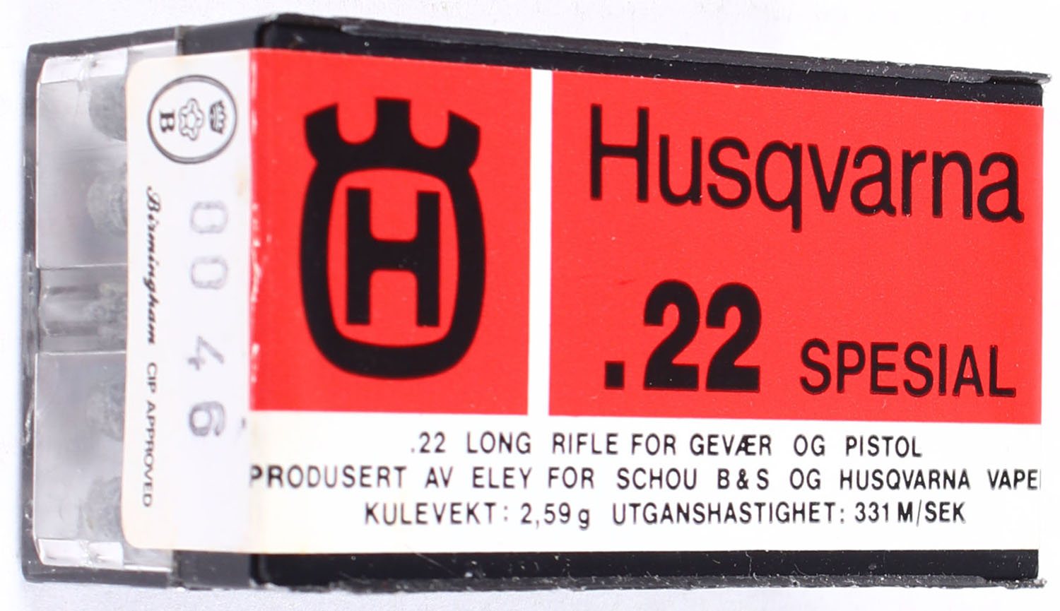 Husqvarna, Spesial, .22 Long Rifle, RHWeb: (Sweden), HUSQ-1 LR-4, FULL & SEALED, 2pc. Clear plastic tray with red sealing label, box is solid with minty color, very minor edge wear, label is intact, ammo is excellent. Grade: Excellent ++ - Value: 20 to 80