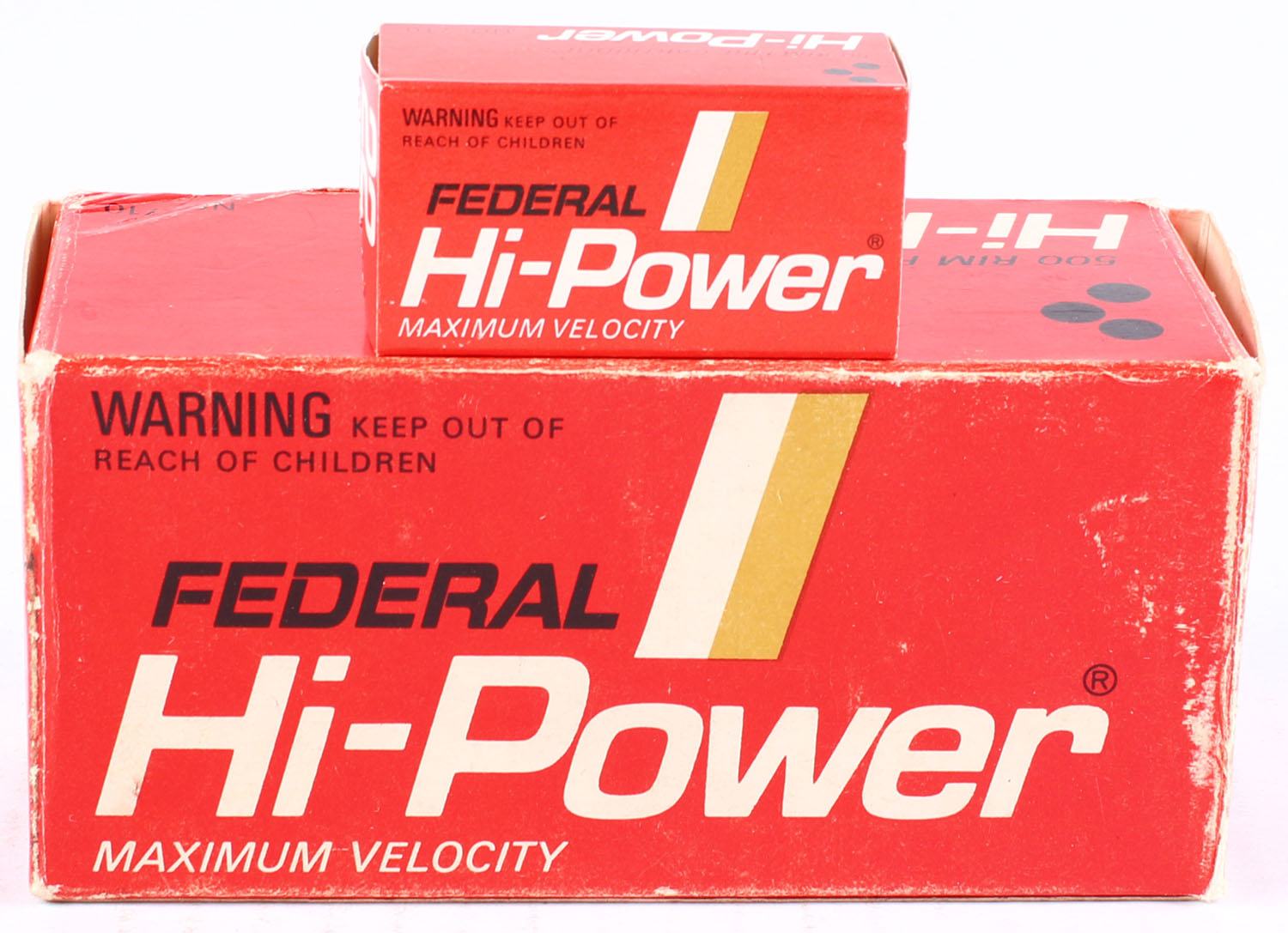 Federal, Hi-Power, .22 Long Rifle, Full, 500rds., 1pc. Red black & white brick, brick has some age soiling with edge & corner wear, end flaps are solid, inside boxes are minty. Grade: Very Good ++ - Value: 30 to 90