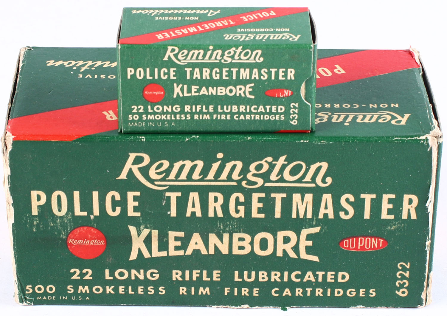 Remington, Police Targetmaster Kleanbore, .22 Long Rifle Lubricated, Full, 500rds., 1pc., Green white & red brick, brick is solid with excellent color, has edge & corner wear, scuffing to bottom, end flaps are solid, inside boxes are excellent. Grade: Very Good ++ - Value: 50 to 150