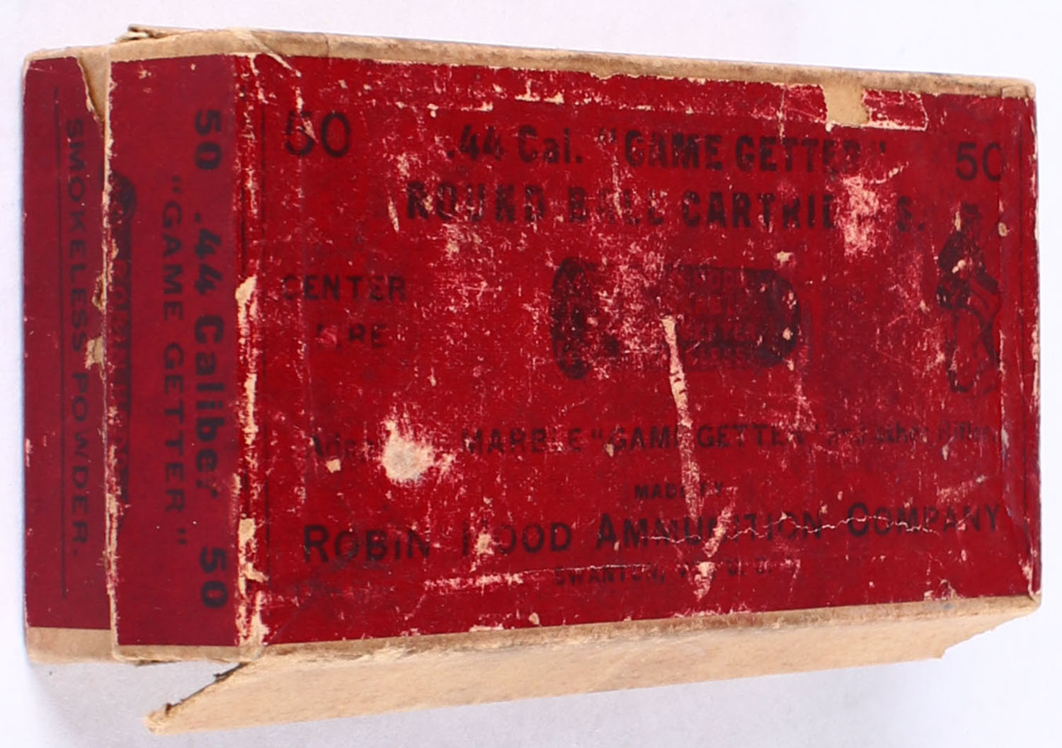 RARE ROBIN HOOD, GAME GETTER, .44 Round Ball Cartridges for Marble ''Game Getter'' Rifles, 2pc., FULL, Central Fire, buff box with red label with black print, box is solid with 96% of labels intact, ammo is near excellent, Very Hard to Find!. Grade: Very Good ++ - Value: 1000 to 3000