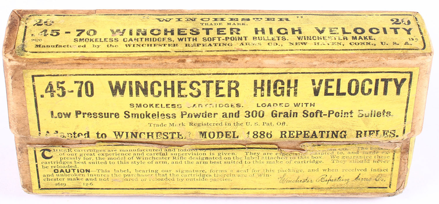 Winchester, .45-70 Winchester High Velocity, Low Pressure Smokeless Powder, 300 Gr. Soft-Point bullet, 2pc, Full, buff box with yellow label & black print, box is solid with nice colors, some light age soiling, Rare H/s: W.R.A.Co. 45-70 WHV with protected primers, ammo is excellent. Grade: Excellent - Value: 200 to 600