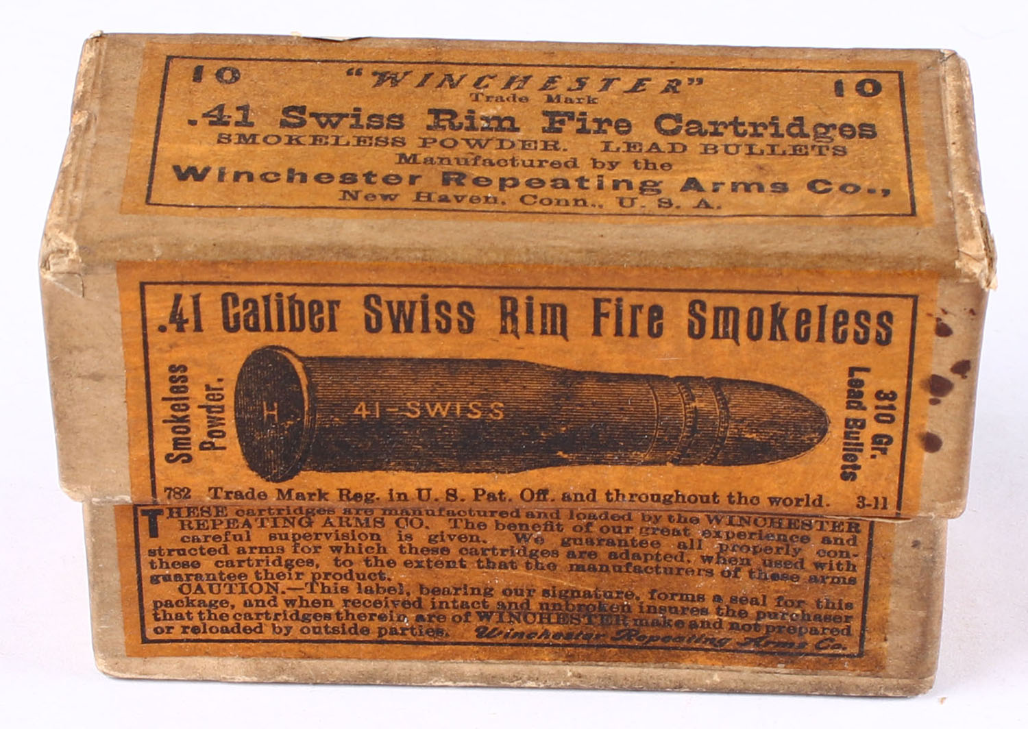 Winchester, Rim Fire Cartridges, .41 Swiss, 310 Gr. Lead Bullets, Smokeless Powder, Full, 2pc. Buff box with orange top & side sealing labels, box is solid with very good color, some age soiling, minor corner wear, edges are mostly crisp, labels are intact, ammo is good to very good. Grade: Excellent - Value: 40 to 120