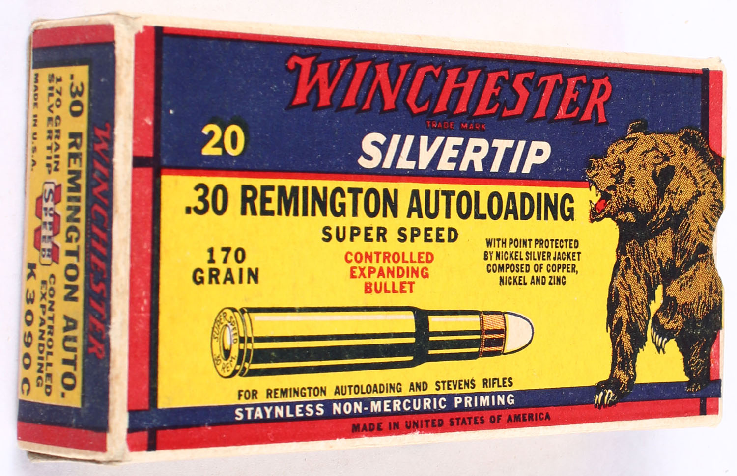 Winchester, Silvertip, .32 Remington Autoloading, 170 Grain Controlled Expanding Bullet, Full, 1pc., yellow blue & red bear box, box is solid with excellent color, end flaps are solid, ammo is excellent. Grade: Excellent - Value: 100 to 300