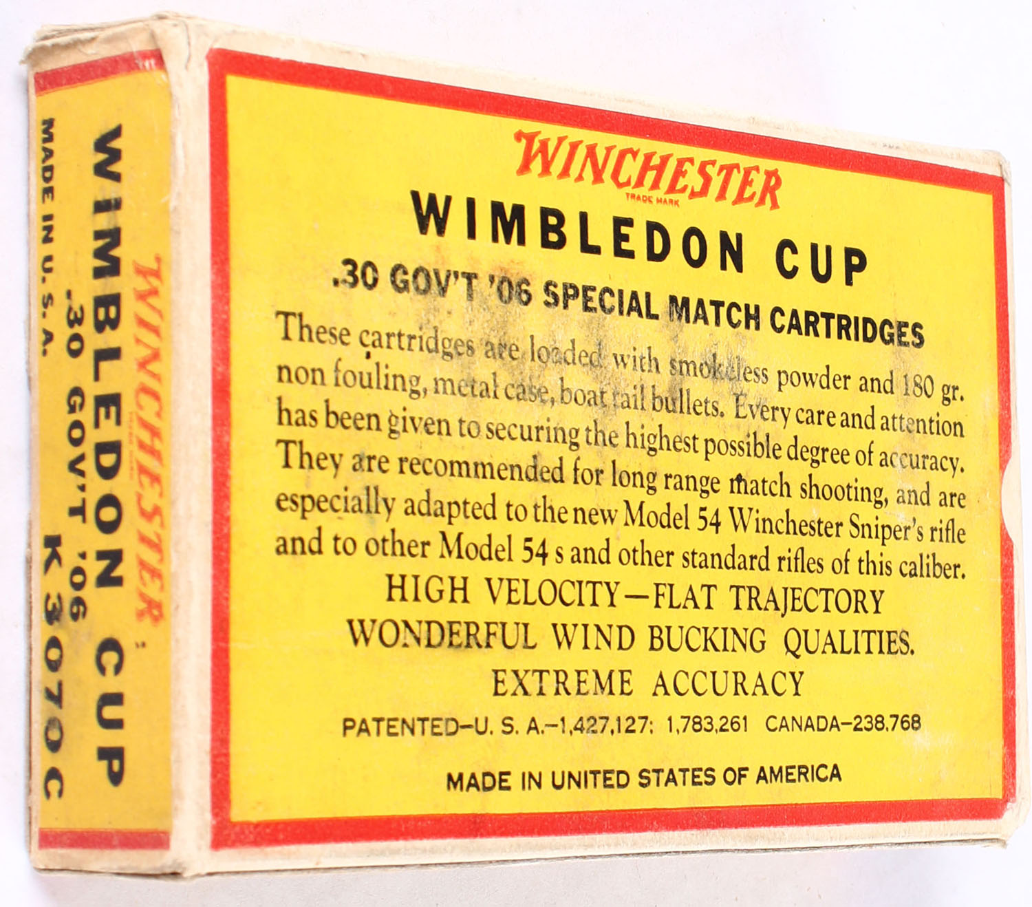 Winchester, Wimbledon Cup Special Match Cartridges, .30 Gov't '06 (.30-06), 180 Grain Full Patch Boat Tail Kopperklad Bullet, For Single Loading Only, Full, 1pc., red yellow & black box, box is solid with excellent color, end flaps are solid, ammo is excellent. Grade: Excellent + - Value: 150 to 300