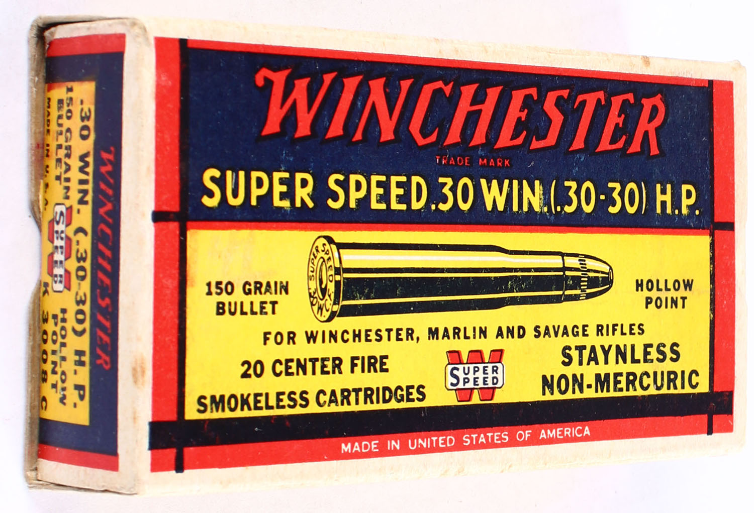 Winchester, Super Speed, .30 Winchester (.30-30), 150 Grain Hollow Point, Full, 1pc. Yellow blue & red box, box is solid with excellent color, very minor shelf & corner wear, edges are mostly crisp, end flaps are solid, ammo is excellent to minty. Grade: Excellent ++ - Value: 50 to 150