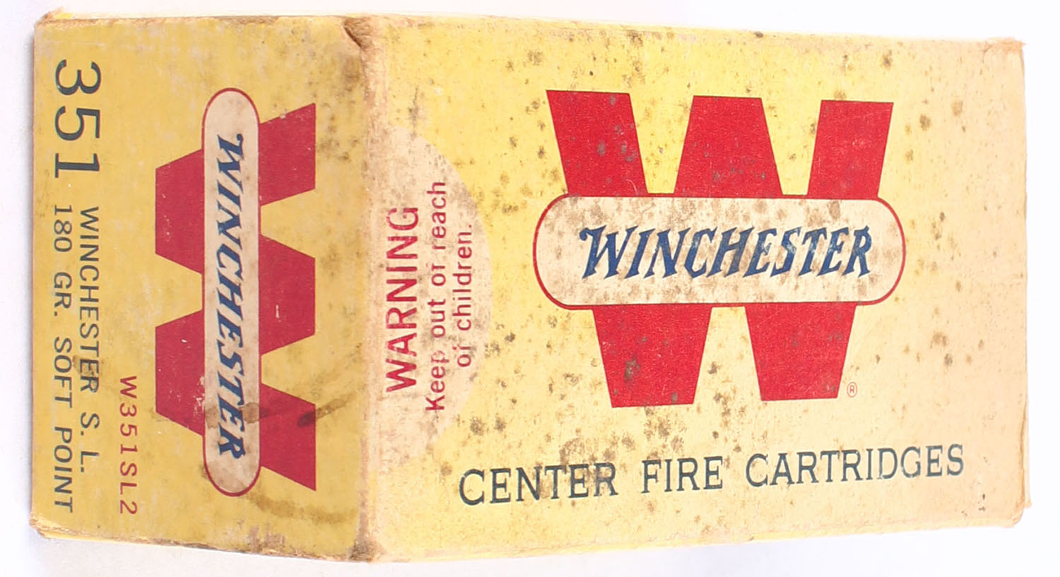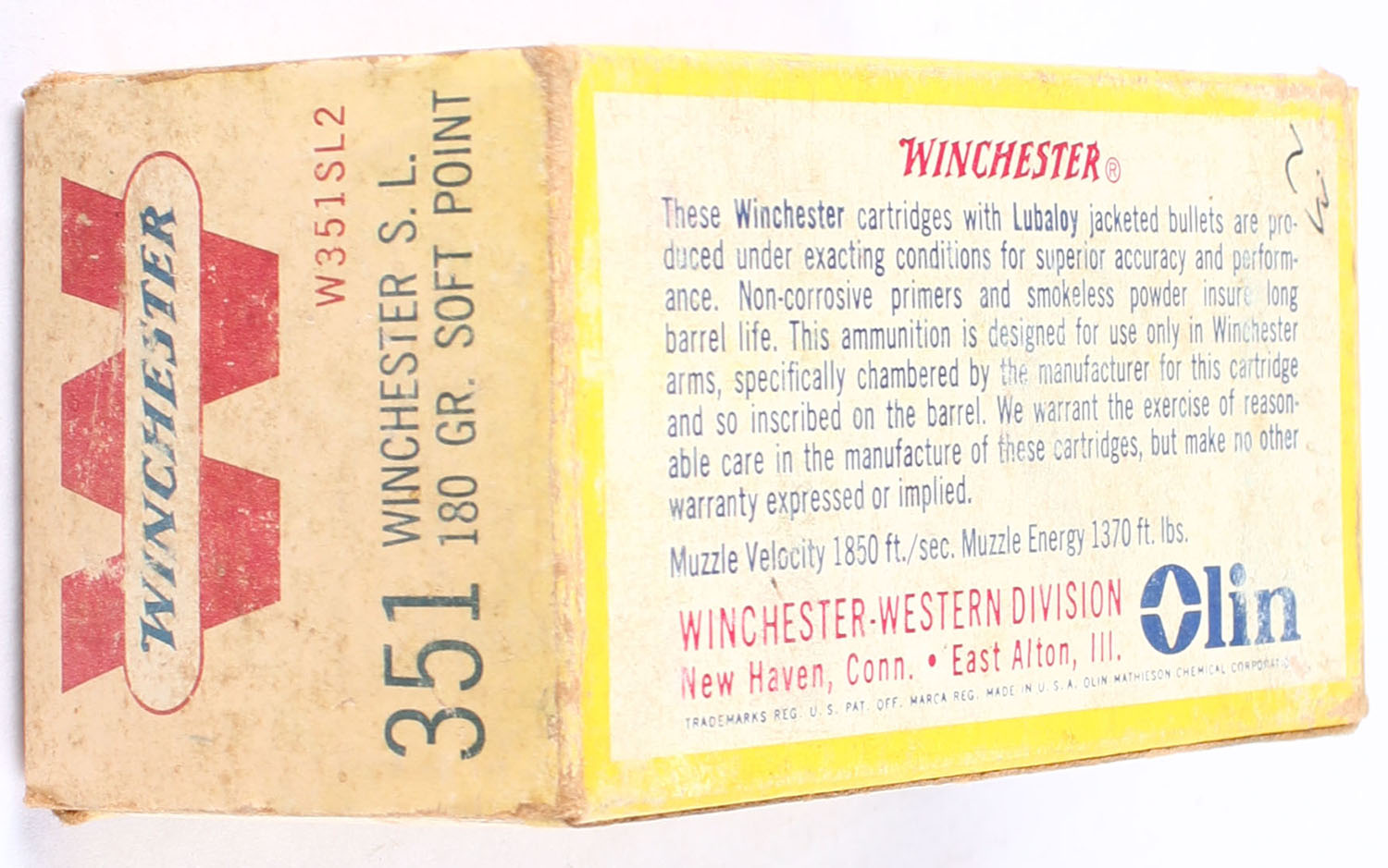 Winchester, Center Fire Cartridges, .351 Winchester Self Loading, 180 Grain Soft Point, Partial 22rds, 1pc. Yellow white & red box, box has age soiling, has light edge & corner wear, end flaps are solid, ammo is very good. Grade: Good ++ - Value: 100 to 200