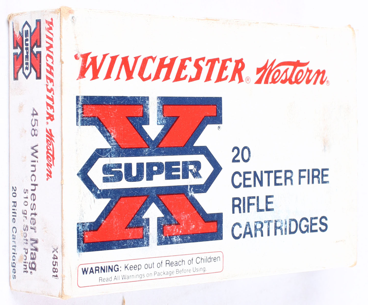 Winchester-Western, Super X, .458 Winchester Magnum, 510 Grain Soft Point, Full, 1pc, White red & black box, box has shelf wear with scuffing, end flaps are solid, ammo is excellent. Grade: Very Good - Value: 60 to 90