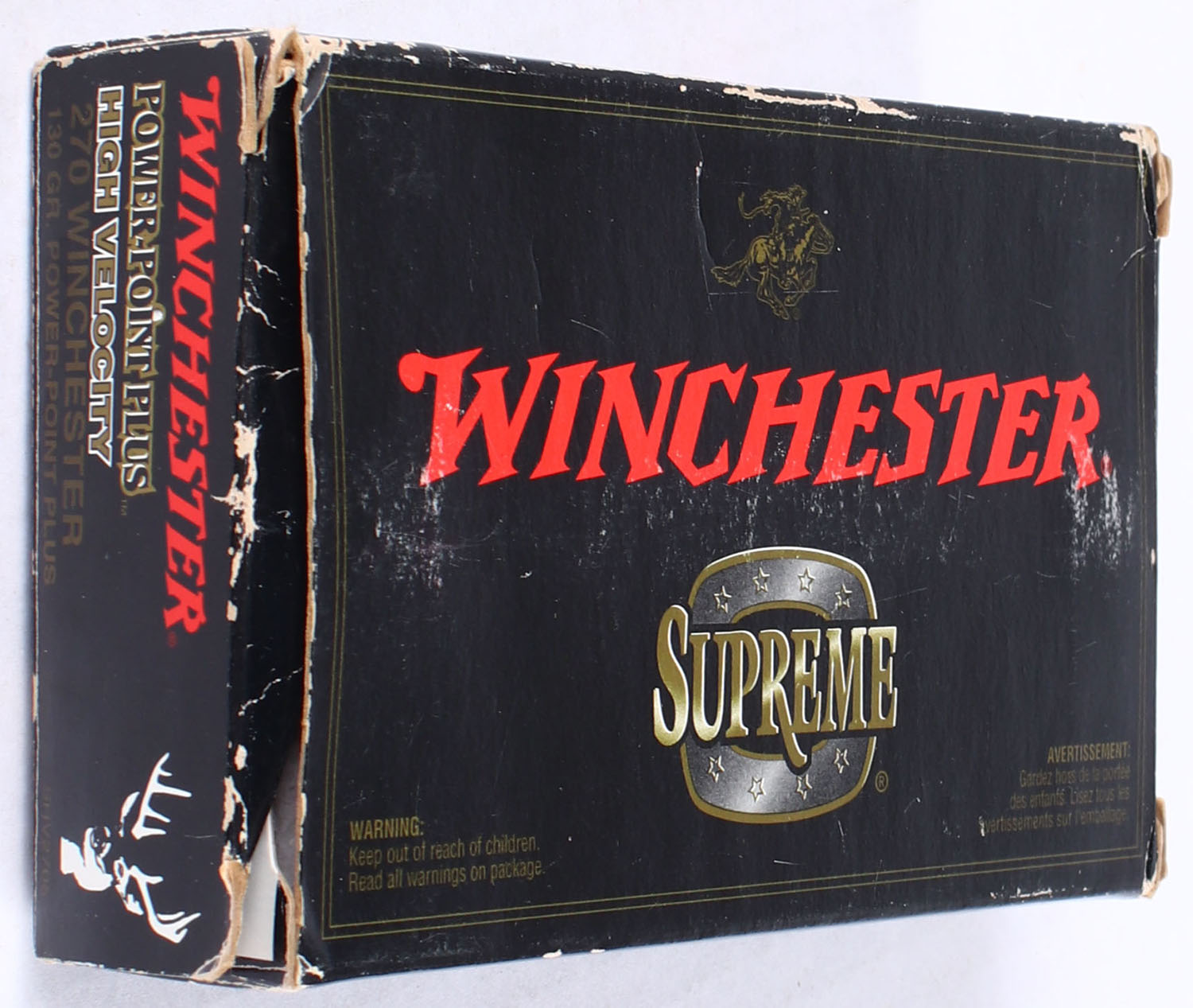 Winchester, Supreme, .270 Winchester, 130 Grain Power-Point Plus, Full, 1pc. Black & red box, box has edge & corner wear with rub marks, end flaps are solid, ammo is good. Grade: Very Good - Value: 24 to 36