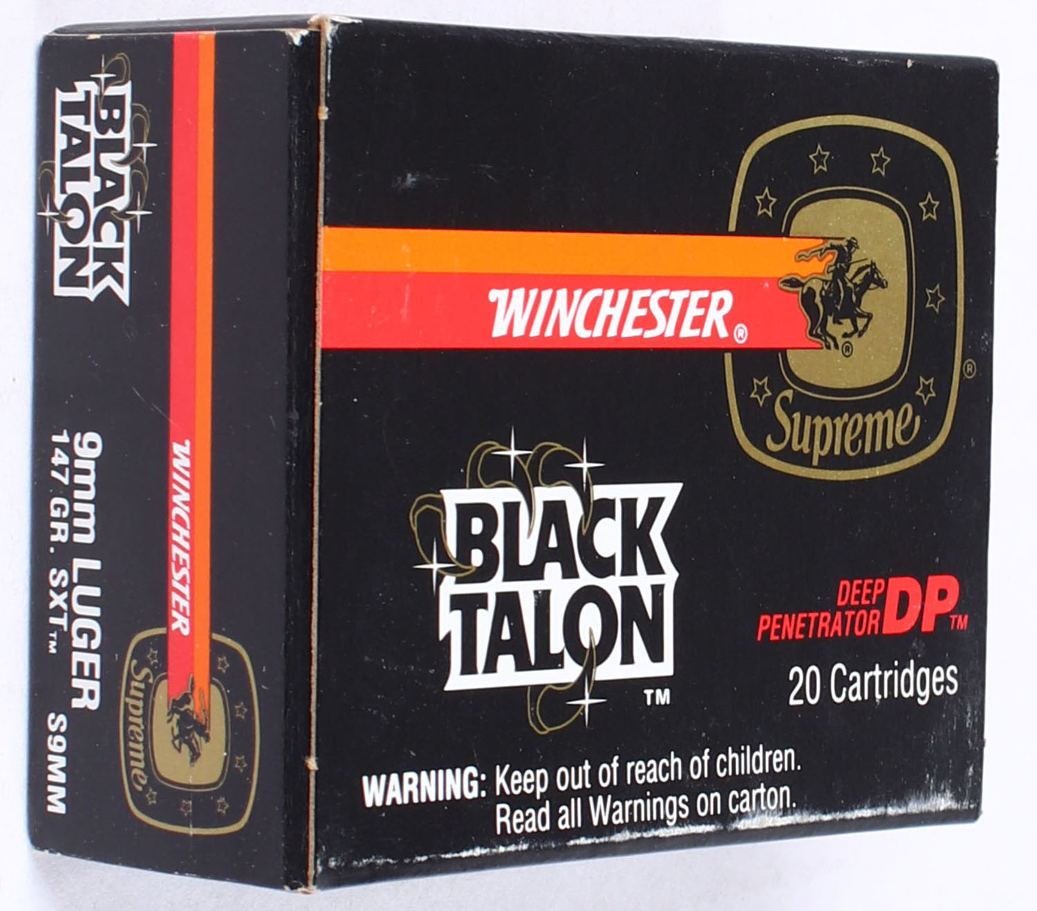 Winchester, Black Talon, 9mm Luger, 147 Gr. SXT, Full, 1pc. Black red & orange box, box is solid with excellent color, very minor corner wear, edges are crisp, end flaps are solid, ammo is minty. Grade: Excellent + - Value: 50 to 75