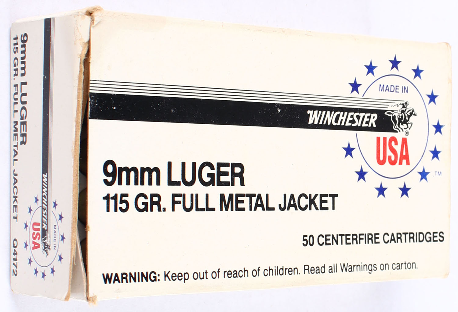 Winchester, USA, 9mm Luger, 115 Grain FMJ, Full, 1pc. White black & red box, box has scuffing with corner wear, ammo is excellent. Grade: Very Good - Value: 24 to 36