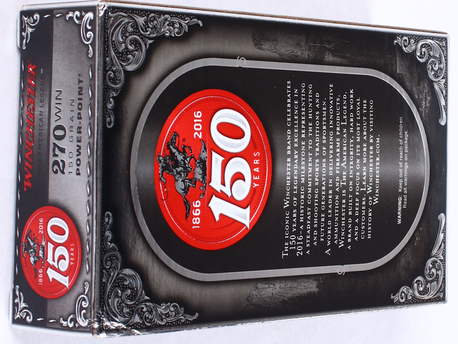 Winchester, The American Legend, 150 Year Commemorative box, .270 Winchester, 150 Grain Power-Point, Full, 1pc. Silver & red box, box is MINT with minty color, corners are sharp, edges are crisp, end flaps are solid, ammo is minty. Grade: MINT - Value: 100 to 150