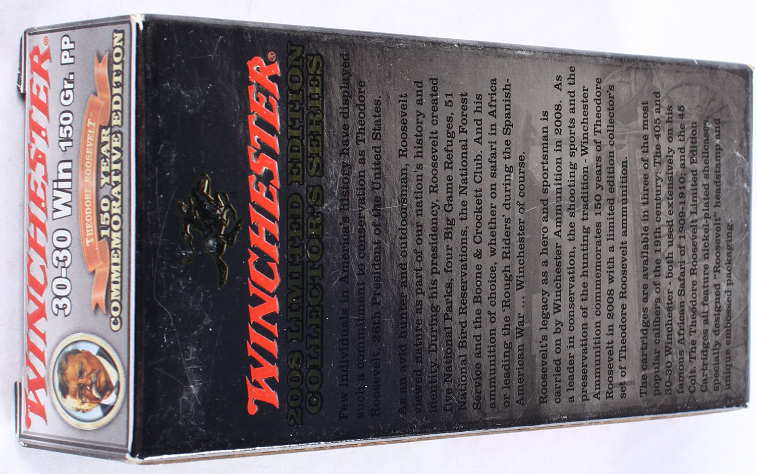 Winchester, Theodore Roosevelt 150 Year Commemorative Series, 30-30 Win, 150 Grain Power-Point, Full, 1pc. Silver box featuring the 26th president, box is very solid with excellent color, minor rub marks to top, corners are mostly sharp, edges are crisp, end flaps are solid, ammo is minty. Grade: Excellent ++ - Value: 100 to 150