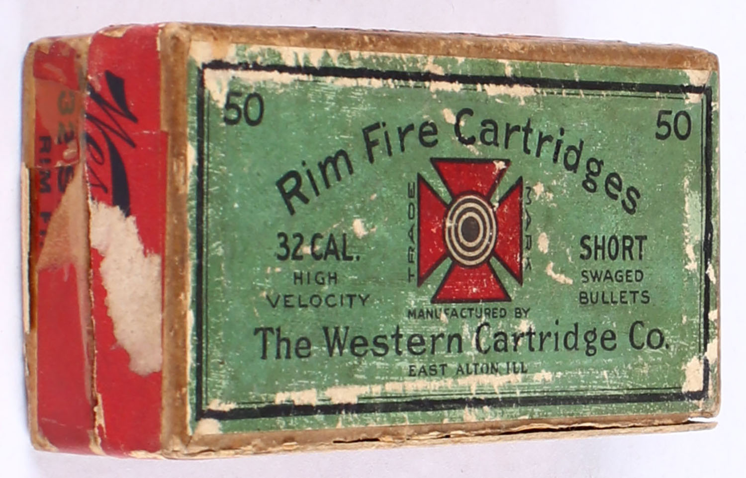 Western, Rim Fire Cartridges, .32 Short, High Velocity, Swaged Bullets, Full, 2pc., Buff box with green top & red side sealing labels, box has tape to bottom & a seam split to top, has some age soiling with light edge & corner wear, labels are intact, ammo is very good. Grade: Very Good + - Value: 120 to 180