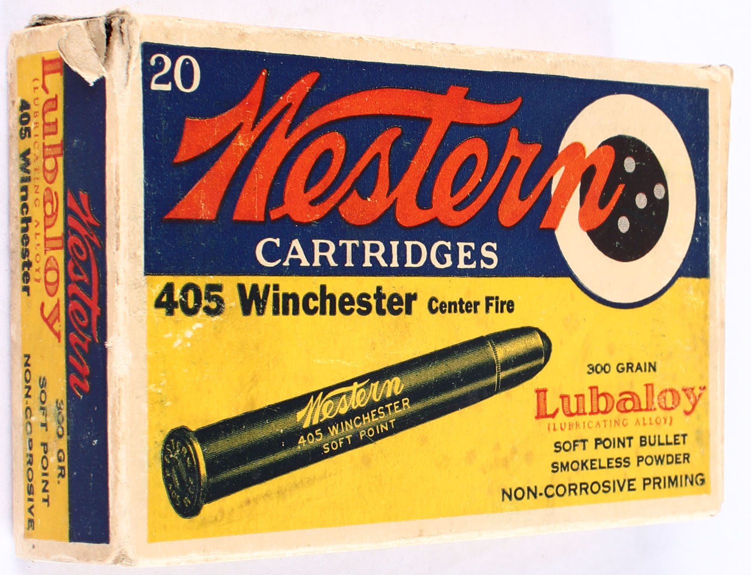 Western, Lubaloy Cartridges, .405 Winchester, 300 Grain Soft Point, Full, 1pc, Yellow blue & red bulls eye box, box is solid with very good color, has light shelf wear with corner wear, has a partial seam split to right end flap, ammo is very good. Grade: Very Good ++ - Value: 70 to 100