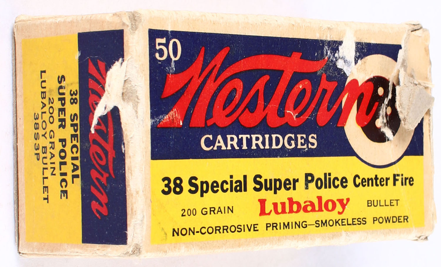 Western, Lubaloy Cartridges, .38 Special Super Police, 200 Grain Coated Bullet, Partial 44rds., 1pc. Yellow blue & red bullseye box, right end flap has tape repair to seam split, has corner & edge wear with a partial tear to front, box has very good to excellent color, ammo is very good to excellent. Grade: Good ++ - Value: 30 to 45