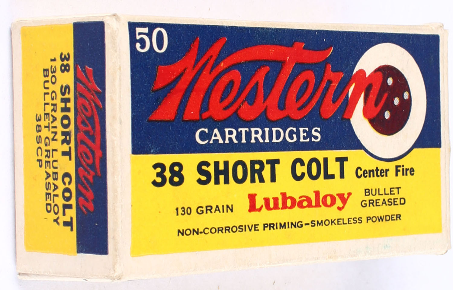 Western Lubaloy Cartridges, .38 Short Colt, 130 Grain Lubaloy Greased Bullet, Full, 1pc., Blue yellow & red bulls eye box, box is very solid with excellent color, corners are mostly sharp, edges are mostly crisp, ammo is excellent. Grade: Excellent + - Value: 50 to 75