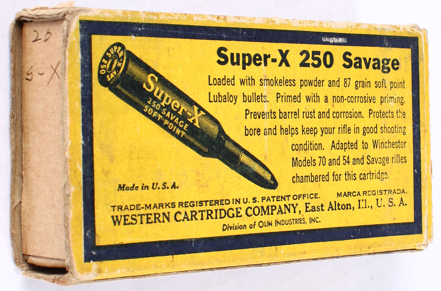 Western, Super-X, .250 Savage, 87 Grain Soft Point Lubaloy Bullet, Full, 1pc. Yellow blue & red box, box has age soiling with edge & corner wear, box is missing right end flap, ammo is very good. Grade: Good + - Value: 40 to 60