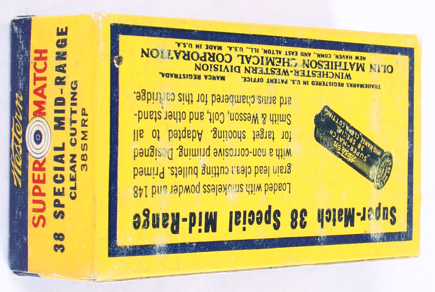 Western, Super Match, .38 Special Mid-Range, 148 Grain Lead Clean Cutting Bullet, Full, 1pc. Yellow blue & red box, box is solid with excellent color, minor scuffing, end flaps are solid, ammo is excellent. Grade: Excellent + - Value: 26 to 40