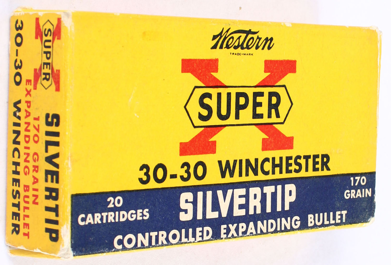 Western, Super-X, .30-30 Winchester, 170 Grain Silvertip Bullet, Controlled Expanding Bullet, Full, 1pc. Yellow blue & red Box, box is very solid with very minor shelf wear, end flaps are solid, ammo is excellent. Grade: Excellent - Value: 40 to 60