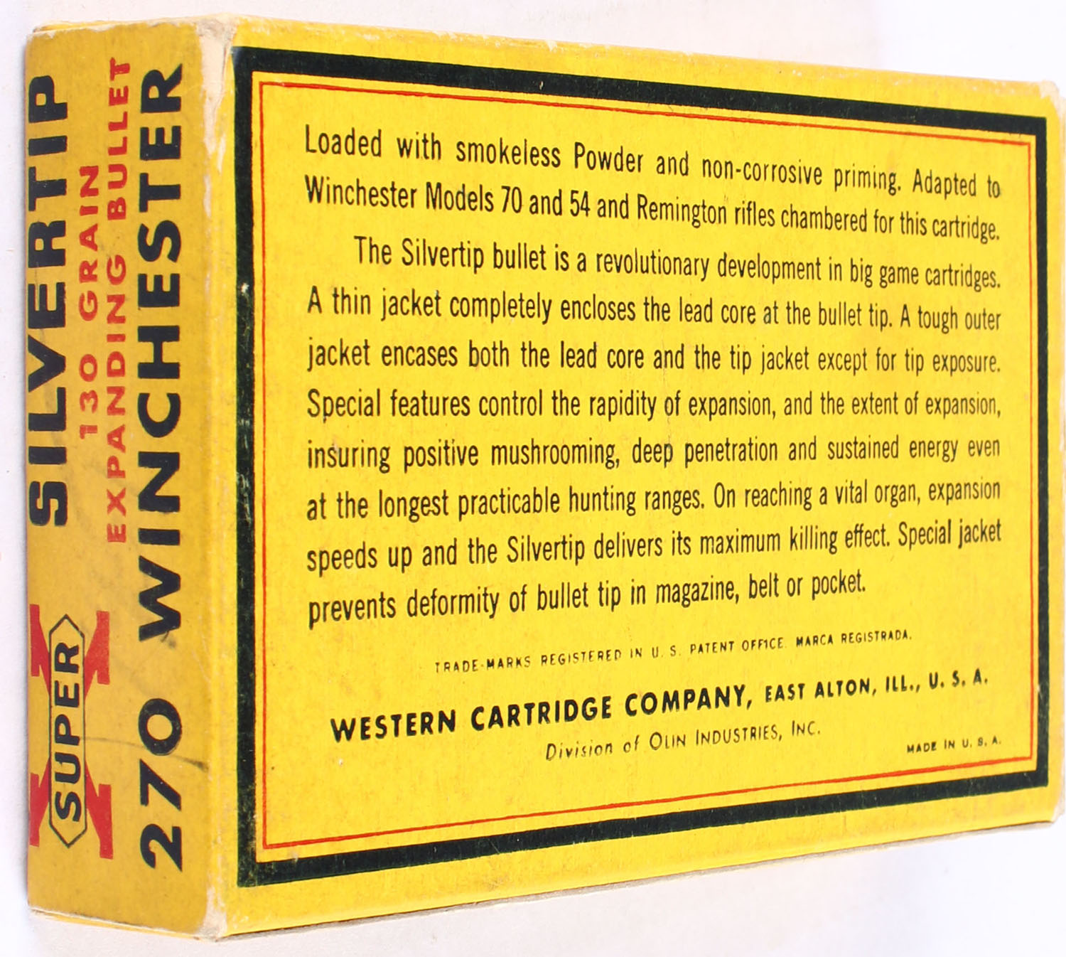 Western, Super-X Silvertip, .270 Winchester, 130 Grain Controlled Expanding Bullet, Full, 1pc. Yellow blue & red box, box is very solid with excellent color, end flaps are solid, ammo is excellent. Grade: Very Good ++ - Value: 30 to 45