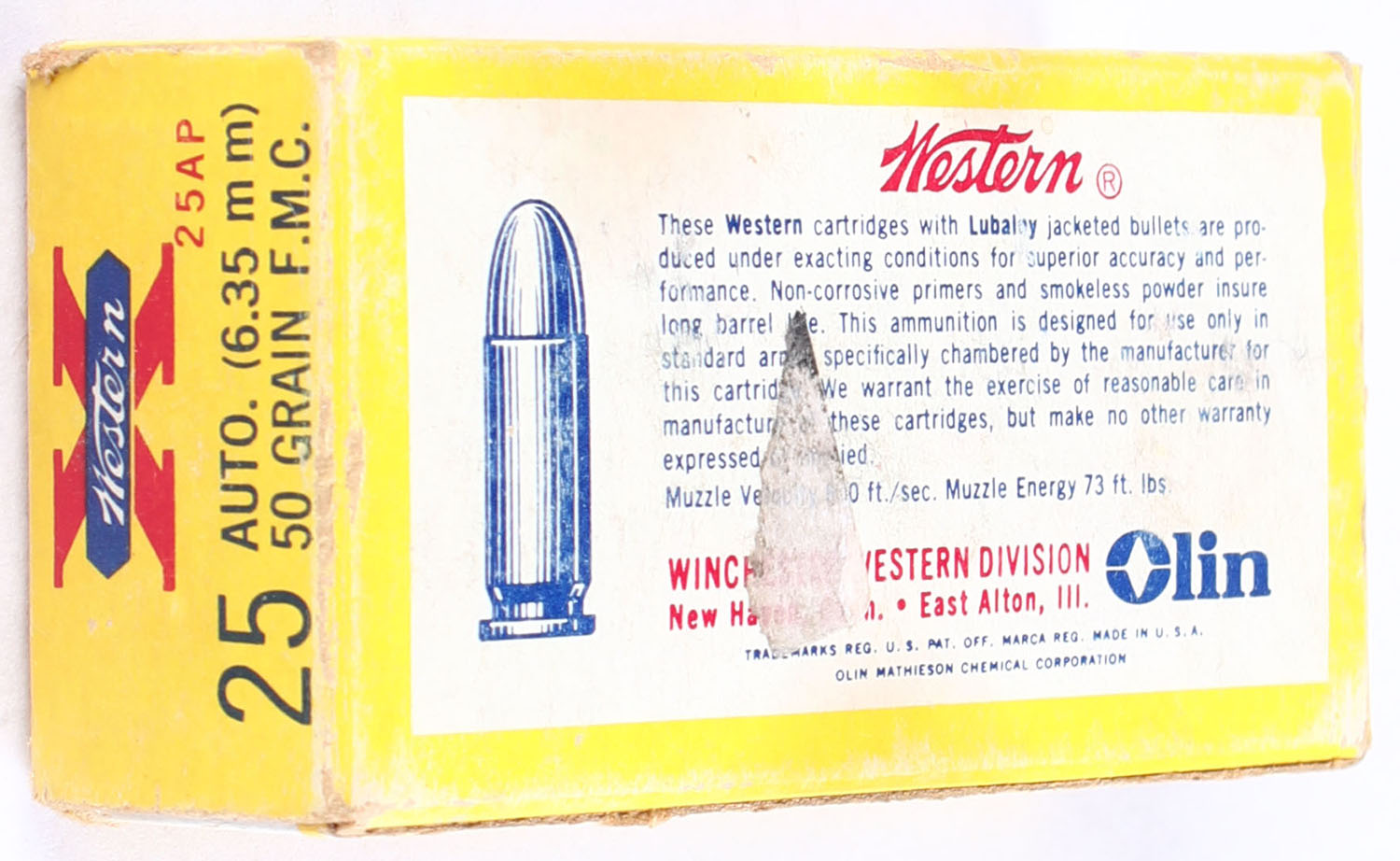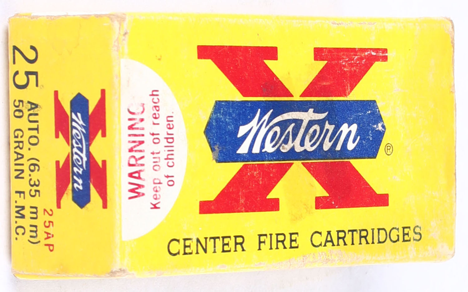 Western, X, .25 Automatic, 50 Grain Full Metal Case, Full, 1pc. Yellow white & red box, box is solid with light scuffing, minor edge wear, end flaps are solid, ammo is excellent. Grade: Very Good ++ - Value: 20 to 30