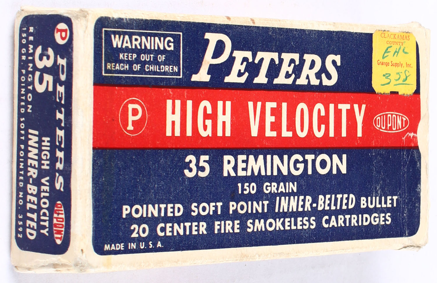 Peters, High Velocity, .35 Remington, 150 Grain Pointed Soft Point Inner-Belted Bullet, Full, 1pc. Blue white & red box, box is solid with great color, has shelf wear with edge & corner wear, end flaps are solid, ammo is very good. Grade: Very Good - Value: 30 to 45